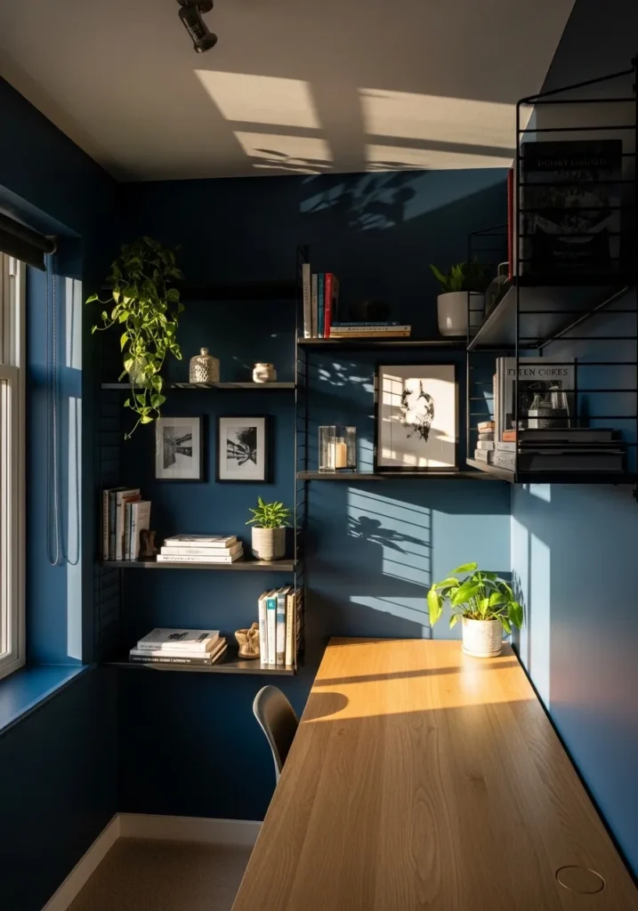 This office wraps the room in a rich deep blue that feels bold yet calming at the same time. The walls and built in shelving are painted in the same saturated tone, which creates a cozy cocoon effect around the desk. Warm wood surfaces add contrast and keep the space from feeling too dark, while small plants and soft lighting bring in life and glow. The sunlight hitting the desk gives the whole room a golden touch that balances the dramatic wall color beautifully.