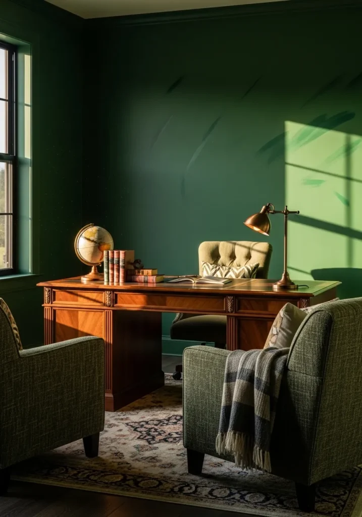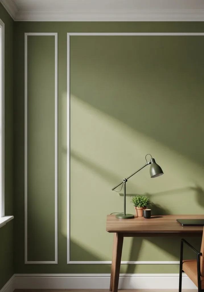 This office features a muted olive green that feels refined and quietly bold. The paneled wall detailing painted in the same tone gives the room a tailored and cohesive look. A simple wooden desk and sleek task lamp stand out beautifully against the green backdrop. The natural light creates subtle variations in the paint, which adds depth and interest.