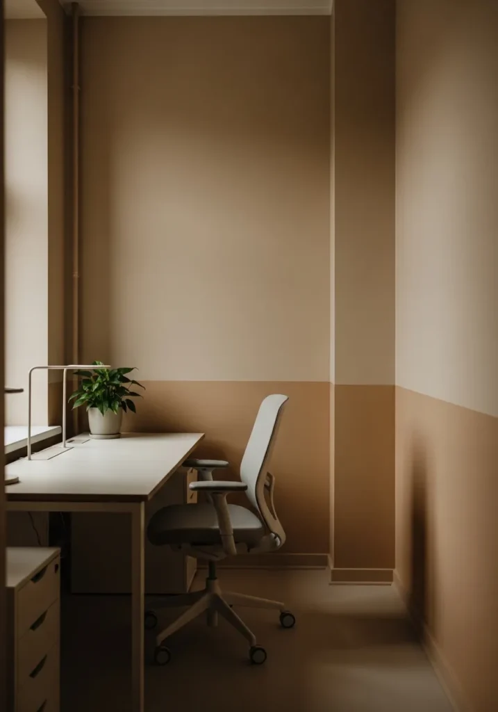 This office uses a two tone beige palette that creates visual interest without being loud. The lower portion of the wall is painted in a deeper warm beige, while the upper section stays lighter for balance. Clean lines and minimal furniture give the space a sleek and uncluttered feel. A simple desk and neutral chair keep the focus on the layered paint detail.