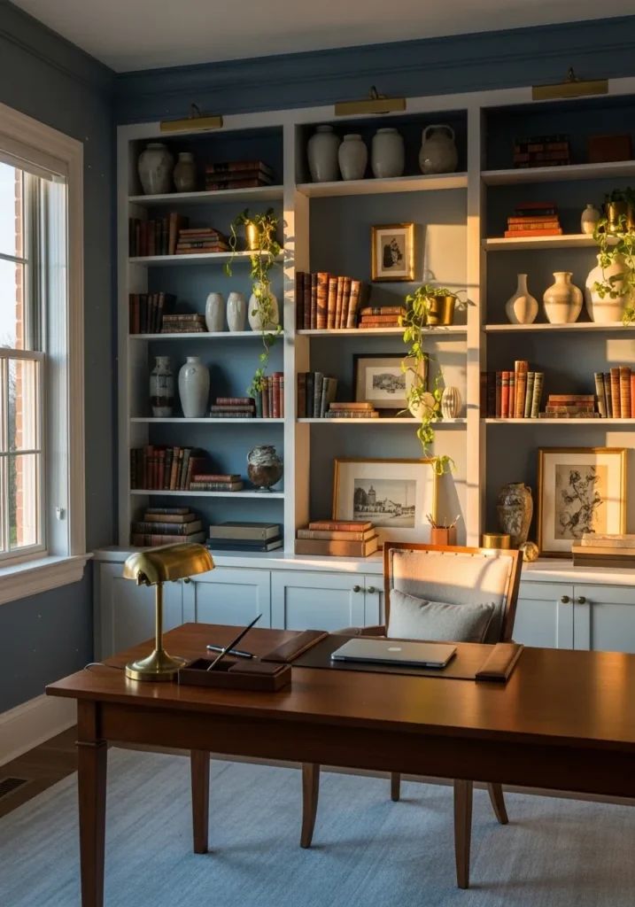 I am completely in love with this kind of setup. The blue feels intellectual and calming at the same time. It makes the room feel like a creative retreat where ideas can really grow. For anyone who dreams of a home office that feels both inspiring and a little bit romantic, this color is such a gorgeous choice.