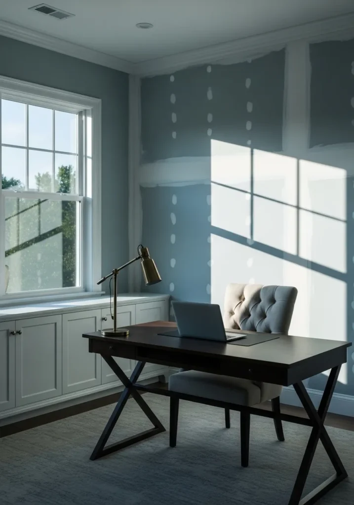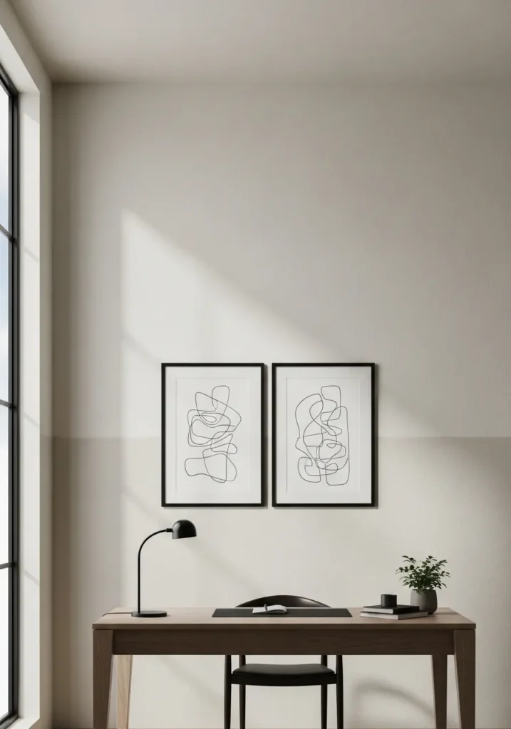 This office is painted in a soft greige that sits perfectly between warm beige and cool gray. The neutral backdrop allows the simple framed artwork and sleek desk to shine without distraction. Natural light washes over the wall and highlights the subtle undertones in the paint. The overall look is clean, understated, and very modern.
