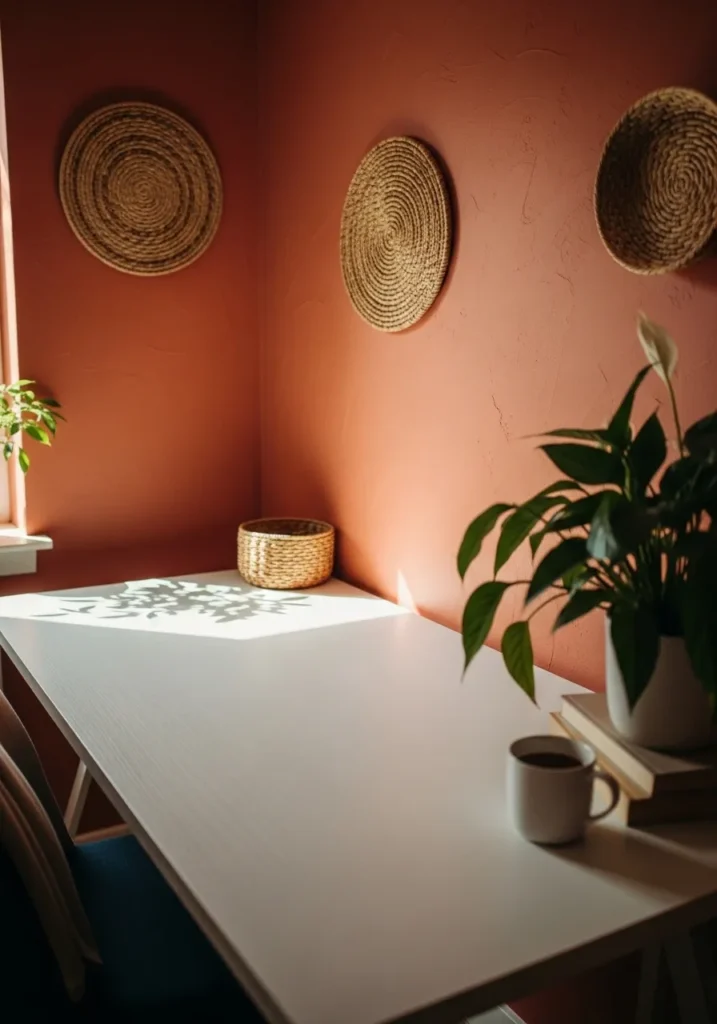 This office glows with a rich terracotta wall color that instantly adds warmth and depth. The earthy tone pairs beautifully with woven wall decor and natural textures, creating a cozy and layered look. A clean white desk keeps the space from feeling heavy, while greenery in the corner softens the bold paint choice. The overall palette feels grounded and sun kissed.