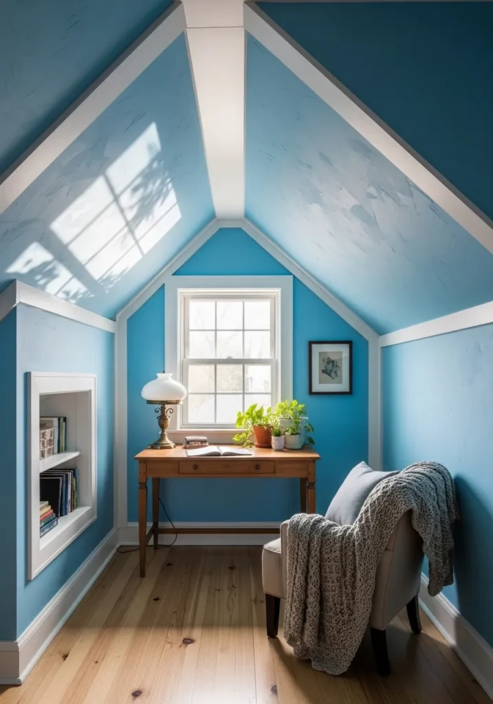 This attic office uses a bright sky blue that feels fresh and uplifting. The sloped ceilings and white beams add architectural charm, while the vibrant wall color brings energy to the small space. A simple wooden desk and cozy throw keep the room feeling welcoming and practical. The natural light from the window makes the blue appear even more vibrant and airy.