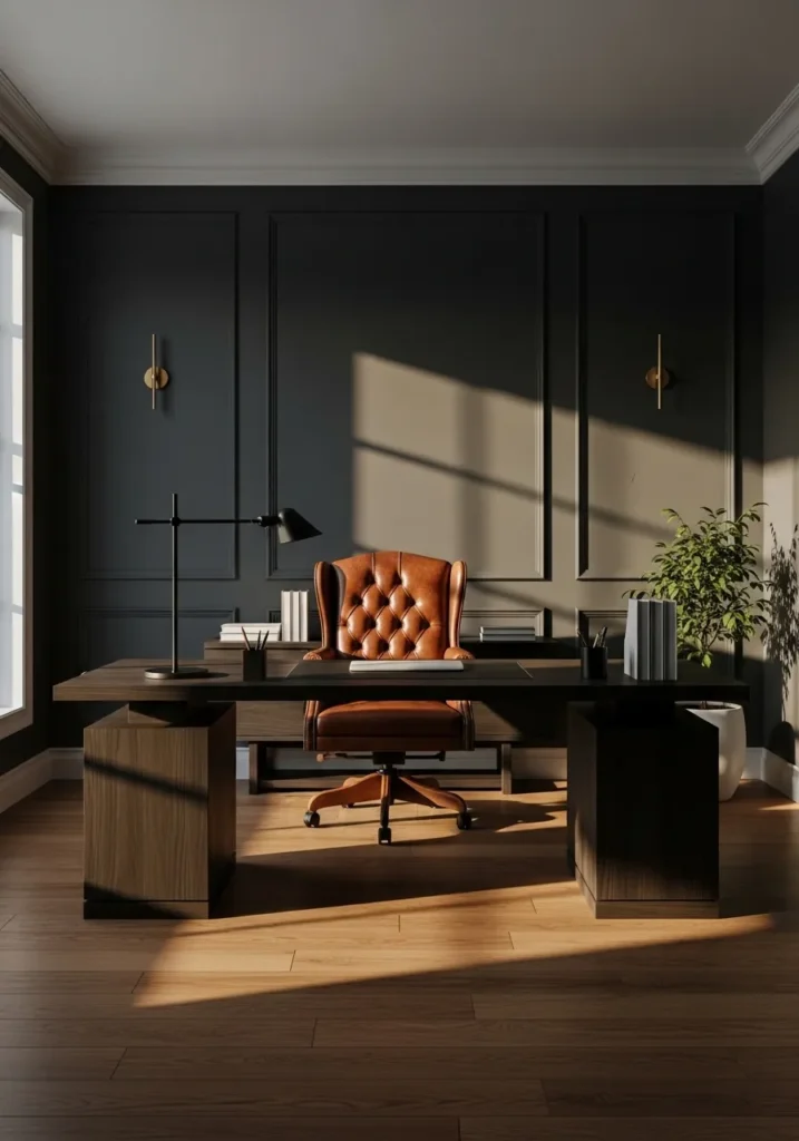 This office leans into a deep charcoal gray that feels dramatic yet refined. The dark walls create a moody backdrop for the warm wood desk and caramel leather chair, which instantly stand out against the rich paint color. Sunlight pouring through the window casts soft shadows across the paneled walls, adding texture and depth. The styling is minimal but elevated, with clean lines and subtle metallic accents that make the space feel polished.