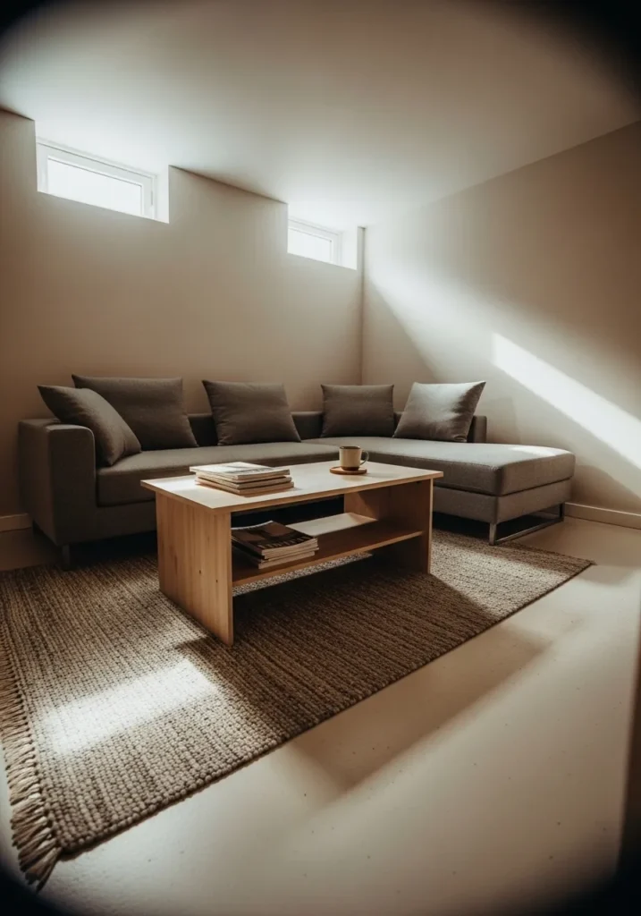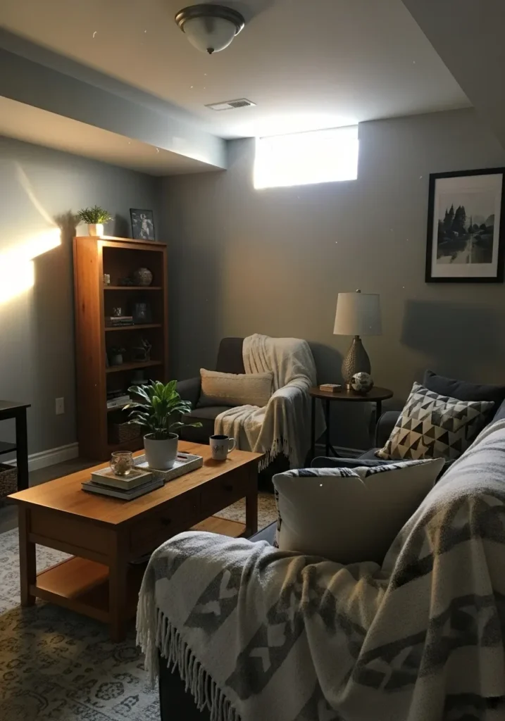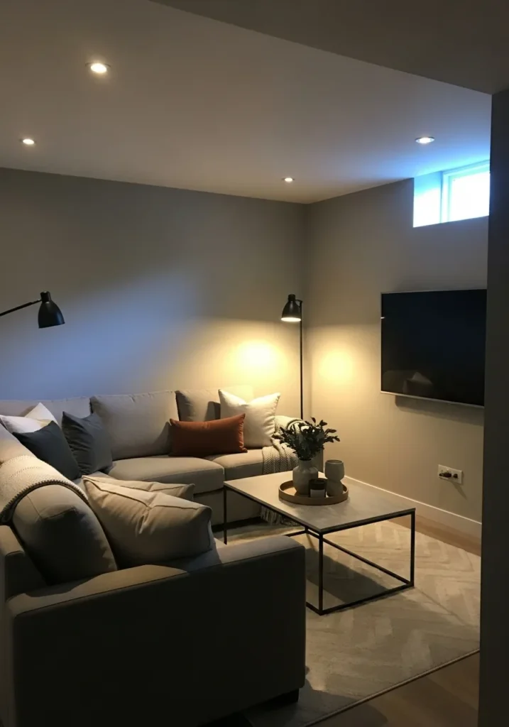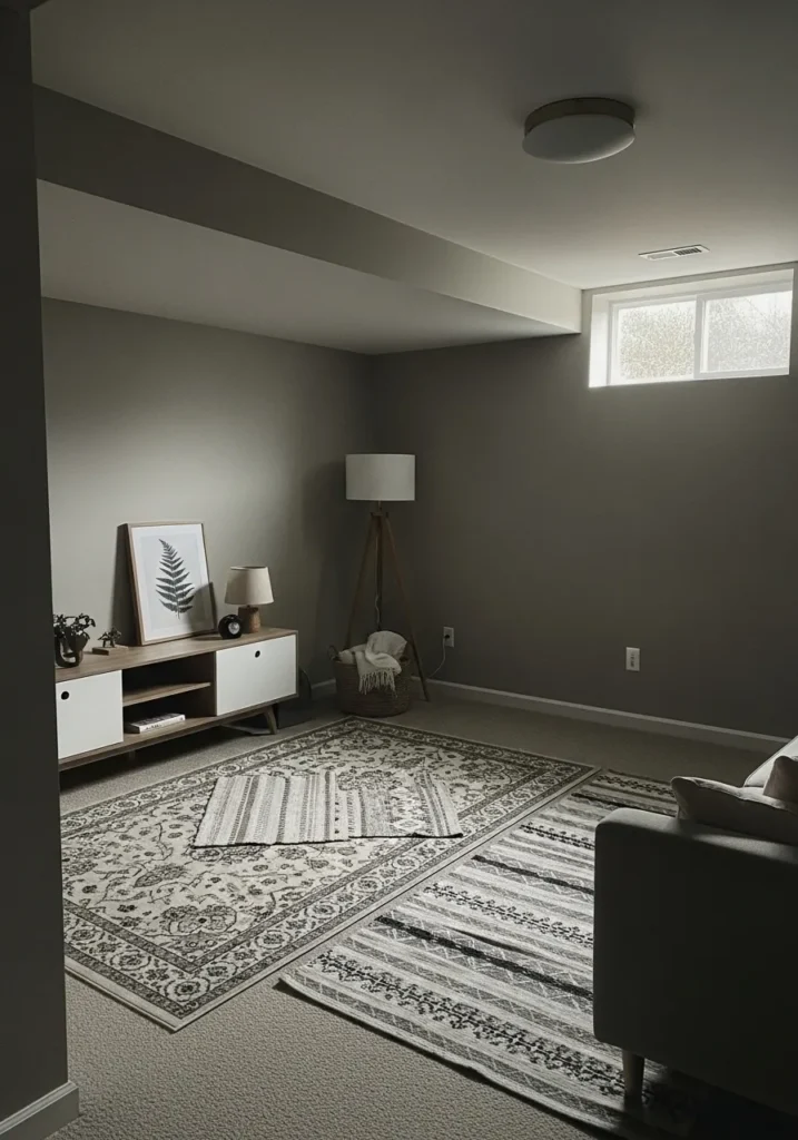 This basement living area uses a balanced medium gray on the walls that feels calm and modern without leaning cold. The soft gray works beautifully with the low ceiling and small window, helping light bounce gently across the room. Neutral textiles, a subtle patterned rug, and simple furniture keep the space feeling open and relaxed rather than heavy.