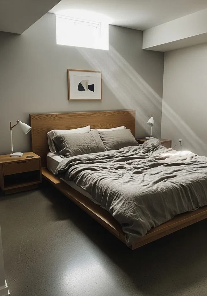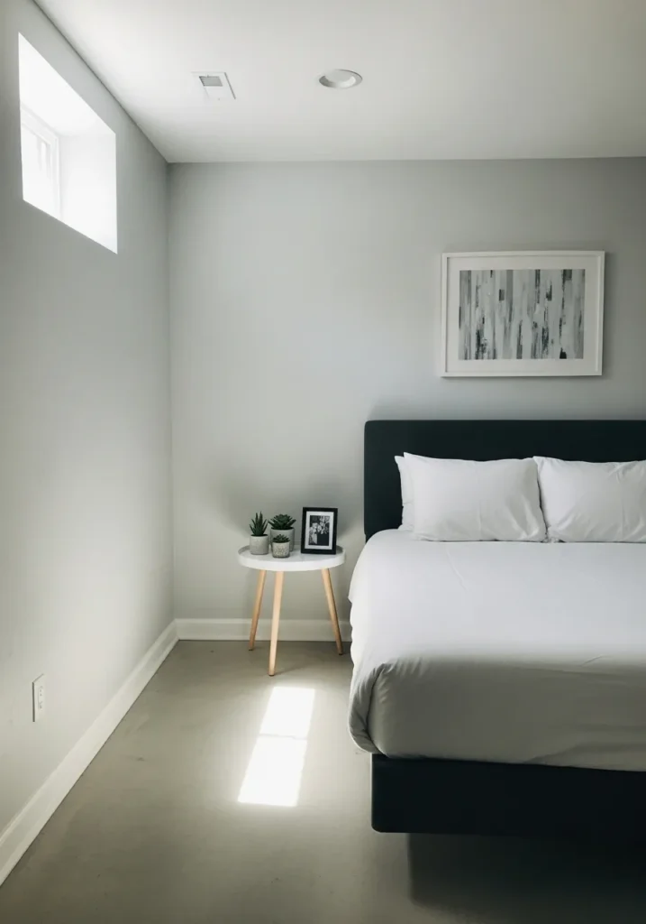 This basement bedroom features a smooth neutral gray that feels calm and grounded. The color pairs nicely with natural wood furniture and soft bedding, creating a space that feels restful instead of cold. Light from the window keeps the gray fresh and shows off its warm undertones.