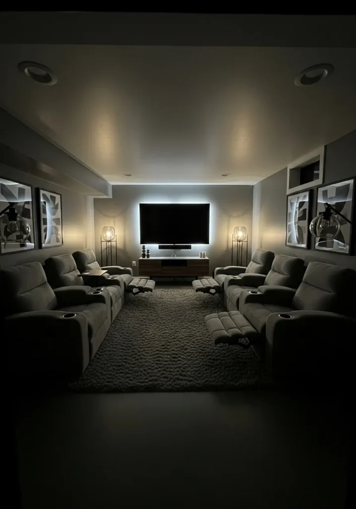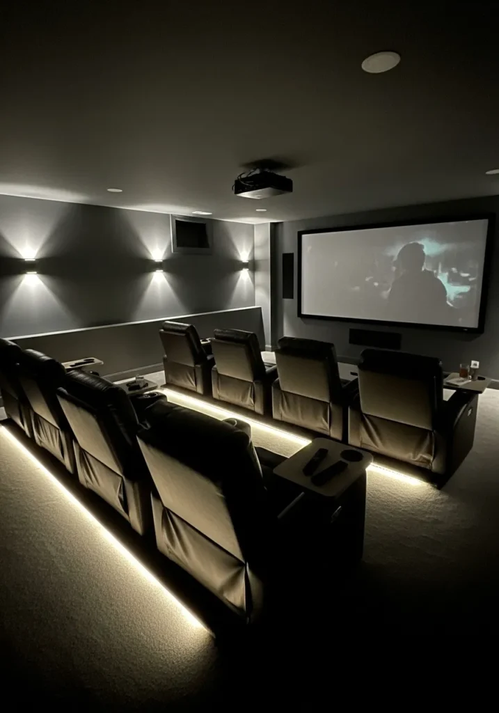 This basement home theater uses a deep charcoal gray that instantly sets a calm and immersive mood. The walls absorb light nicely, while the soft floor lighting and recessed ceiling lights add just enough glow to keep the space comfortable. The gray creates a balanced backdrop that makes the screen feel like the natural focal point without overwhelming the room.