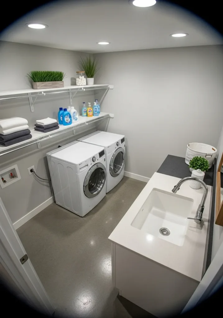 Clean Gray Basement Laundry Room