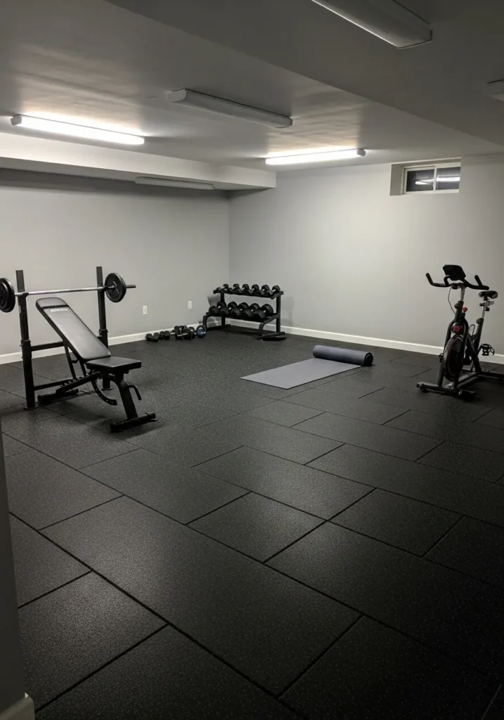 This basement gym uses a darker gray that feels strong and focused. The color grounds the space and pairs well with black flooring and simple equipment. Clean lines and minimal decor keep the room feeling modern and uncluttered.