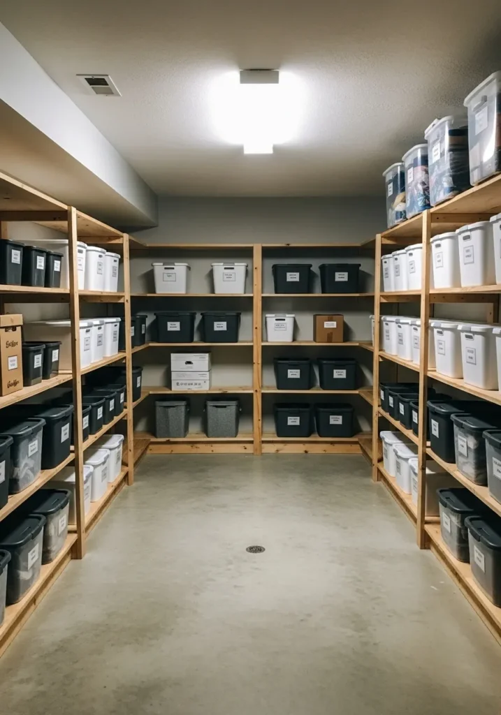 Organized Gray Basement Storage Room