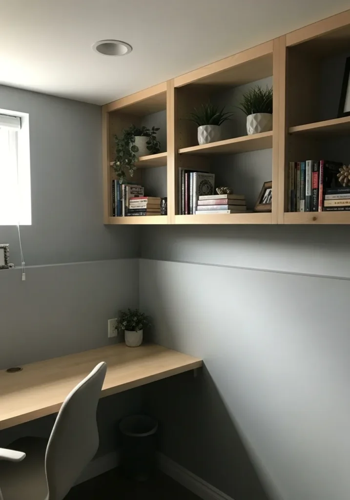 This small basement office uses a clean mid tone gray that feels structured and modern. Built in shelving and a simple desk setup pair well with the wall color, giving the space a polished look without feeling stiff. Natural light from the window softens the gray and keeps the nook from feeling boxed in.