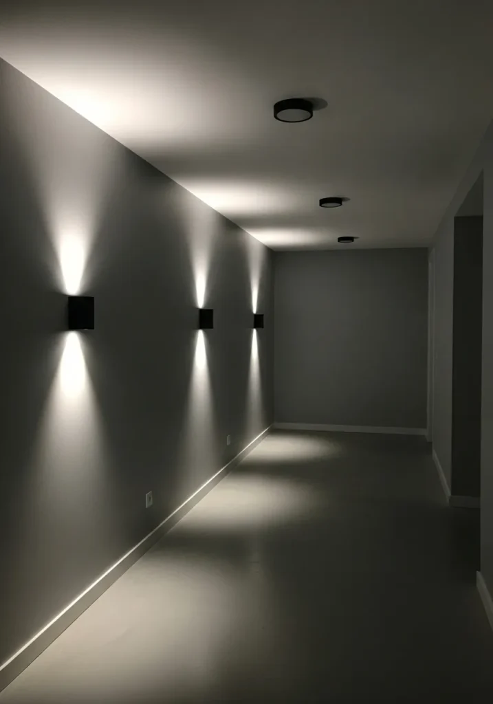This hallway uses a darker gray paired with modern wall lighting to create a clean and contemporary look. The lighting adds depth and prevents the gray from feeling flat, while the smooth flooring keeps the space feeling open and uncluttered.
