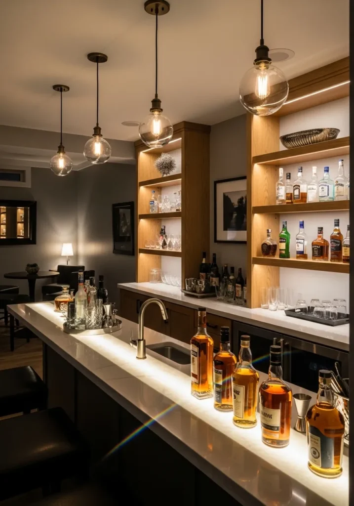 This basement bar uses a rich mid tone gray on the walls that feels sleek and modern without stealing warmth from the space. The gray pairs beautifully with wood shelving, soft lighting, and metallic details, creating a layered look that feels intentional and cozy. The lighting reflects gently off the gray, adding depth instead of making the room feel dark.