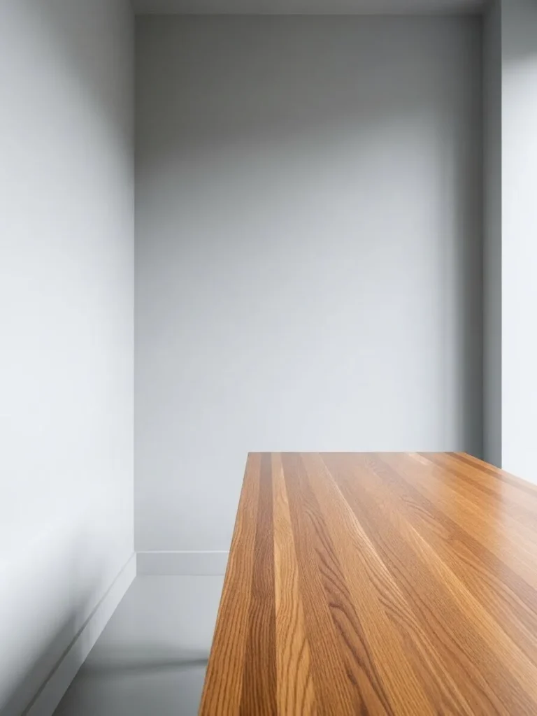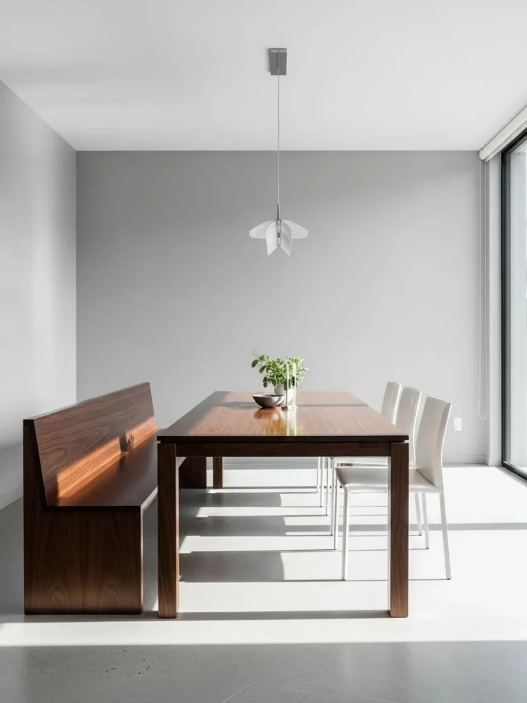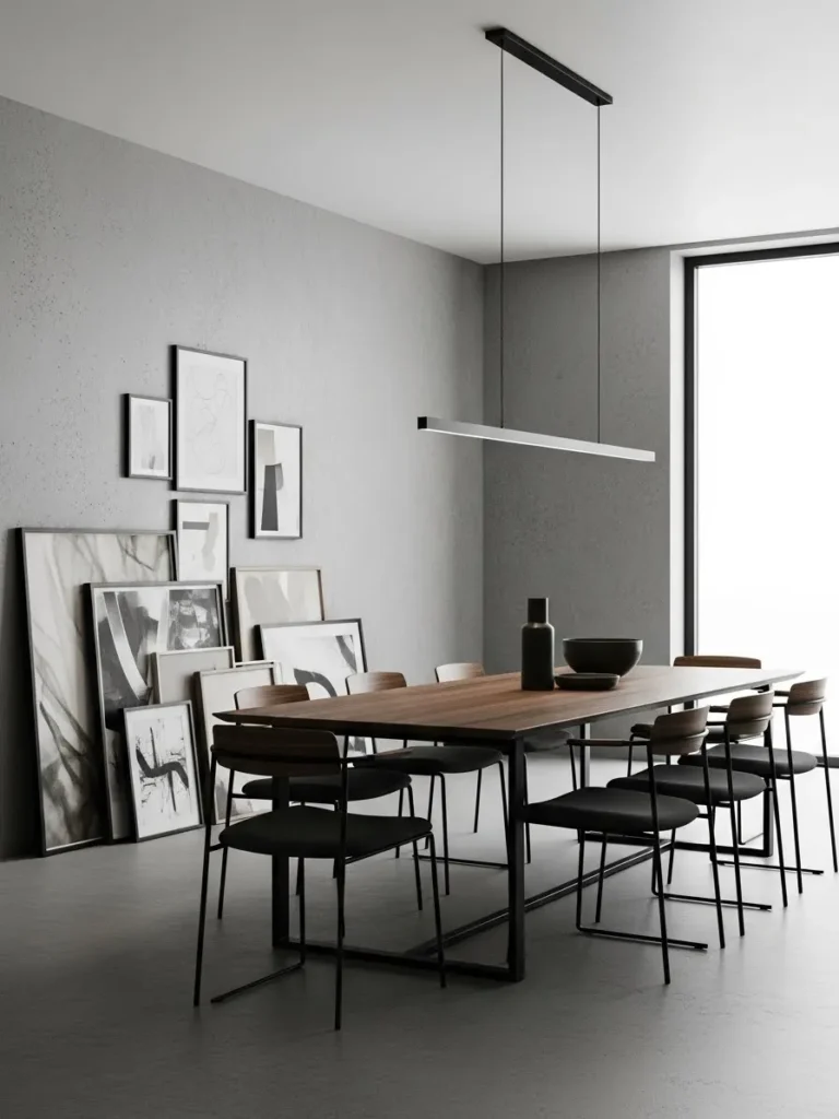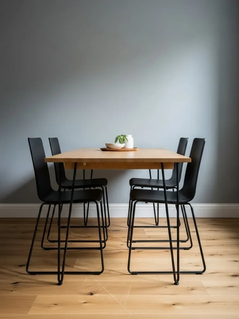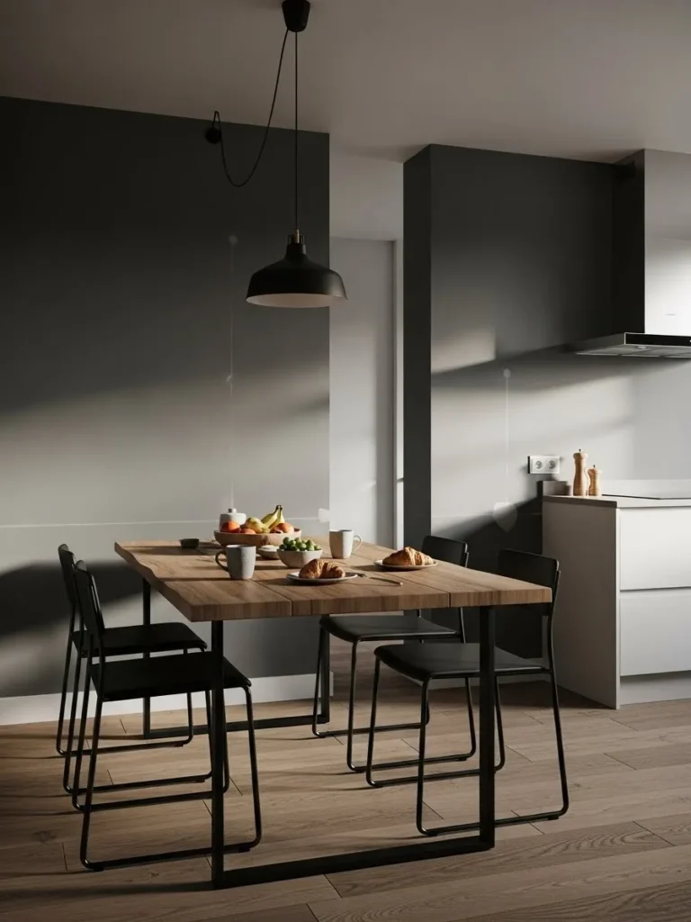 This dining space focuses on clean geometry and a cool gray wall that feels fresh and uncluttered. The wooden tabletop adds warmth against the smooth gray surface, creating a nice contrast that feels modern but still inviting. The narrow layout makes the room feel intentional and calm, almost like a quiet corner made just for slow meals.
