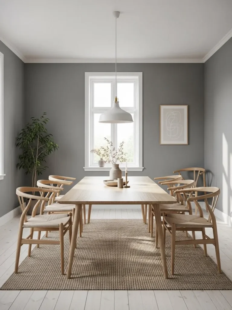 I am really drawn to how effortless this dining room feels. The gray walls make everything feel calm and put together, while the light wood keeps it soft and friendly. It gives me that calm Scandinavian vibe that always feels timeless and easy to live with.
