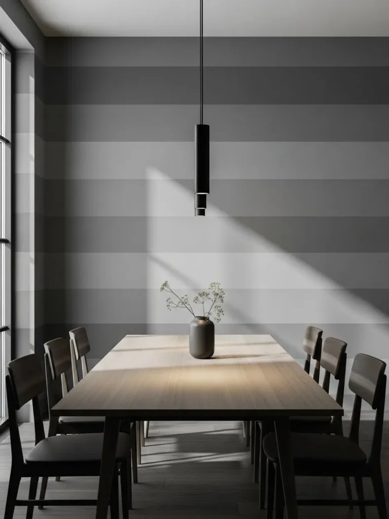 This dining room adds visual interest with subtle horizontal striping on the gray walls. The pattern gives the space depth without feeling busy. A simple wooden table and dark chairs keep the room grounded and modern, while the lighting adds a clean finishing touch.