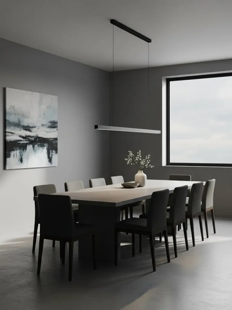 I think this design feels confident and stylish without trying too hard. The gray walls ground the space, and the darker elements add just enough edge to keep things interesting. This is the kind of dining room that feels polished but still relaxed enough for everyday meals.