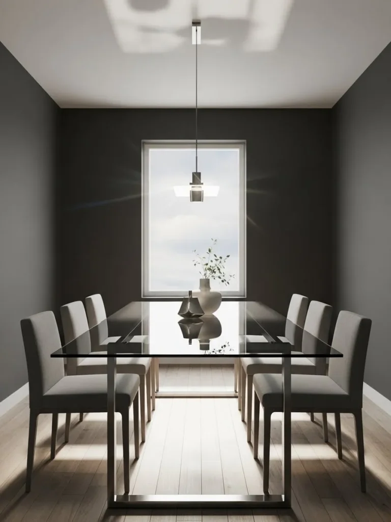 This space leans into a deeper gray tone that feels bold and modern. The dark walls frame the window beautifully, letting natural light take center stage. A glass dining table and structured chairs keep the room feeling clean and balanced, even with the darker paint choice.