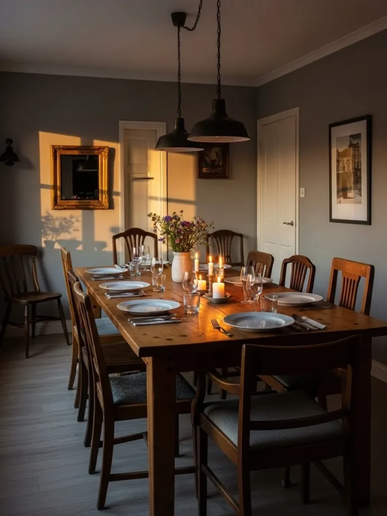 This dining room blends soft gray walls with warm lighting and classic wooden furniture. The long table creates a welcoming centerpiece, while candles and layered light give the room a cozy, intimate feel. The gray paint works as a calm backdrop that ties everything together.