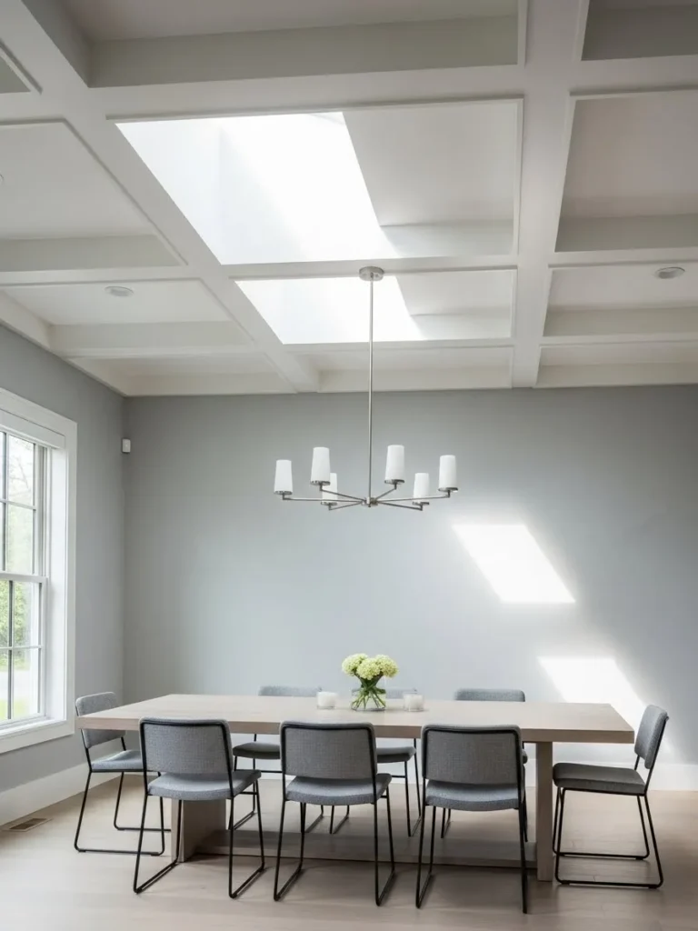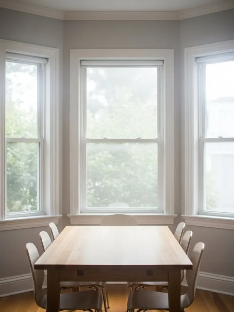 This dining room feels bright and open thanks to large windows and a soft gray wall color. The gray paint reflects the daylight beautifully, making the room feel fresh and spacious. A simple wooden table and matching chairs keep the look cohesive and timeless.