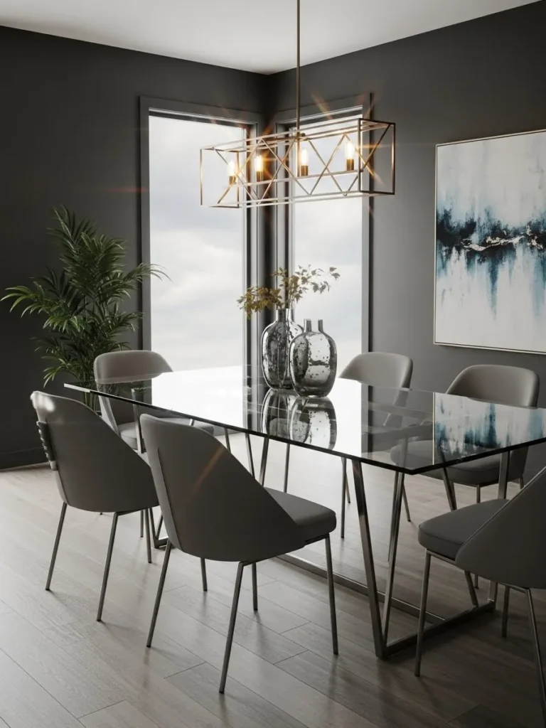 This dining room combines a medium gray wall color with glass and metal accents for a polished look. The glass table keeps the room feeling open, while the gray walls add depth and structure. Artwork and greenery soften the overall design.