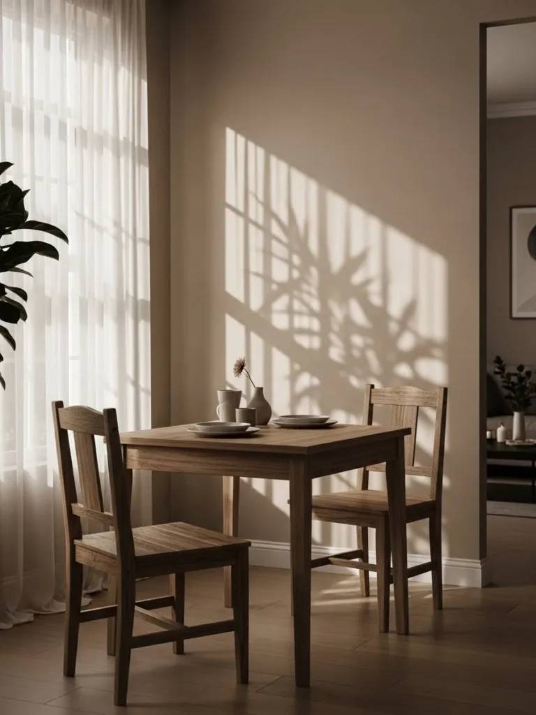 This small dining nook uses a soft gray wall color that feels calm and gentle. The simple wooden table and single chair create an intimate setting, while sunlight adds warmth and softness. The gray paint helps the space feel cozy rather than bare.