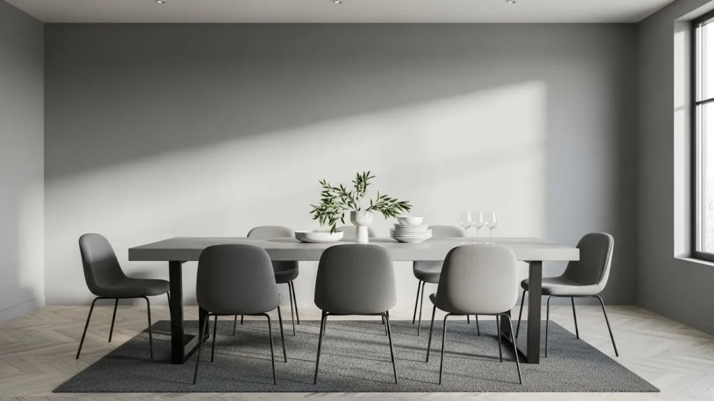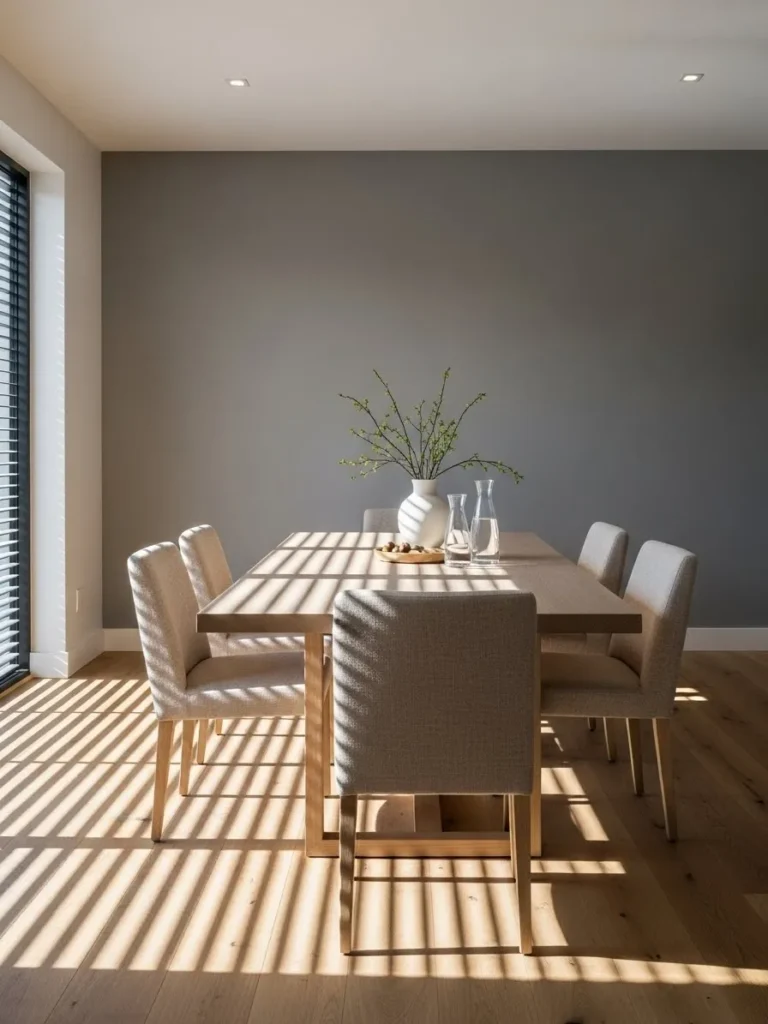 This space uses a soft gray wall color to highlight clean lines and simple forms. The wooden table and sleek chairs create a modern look that feels calm and uncluttered. Natural light brightens the room and keeps the gray from feeling too cool.