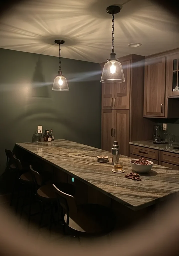 This basement bar area uses a deeper green tone that feels cozy and intimate.