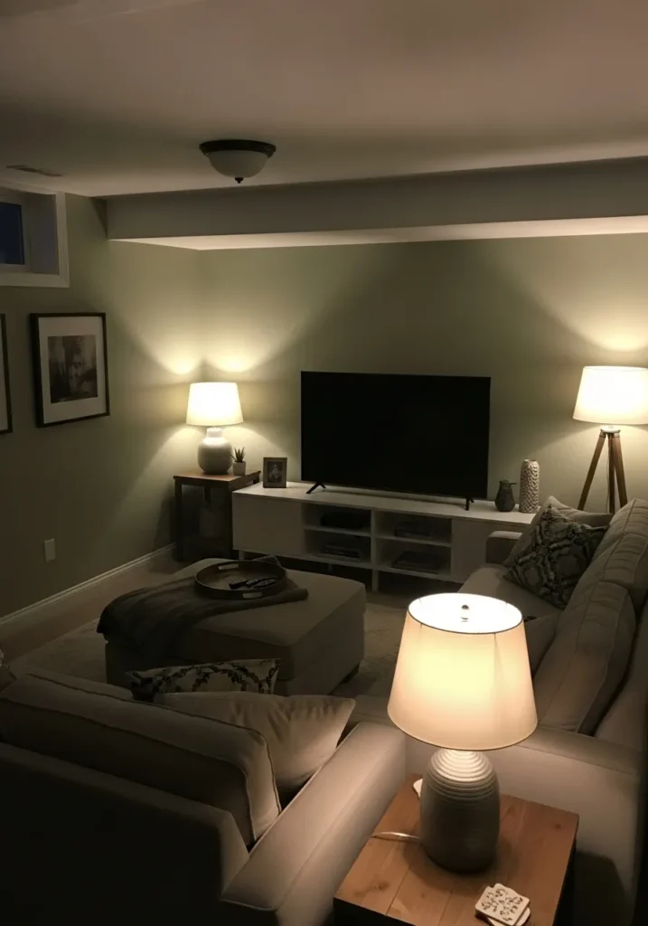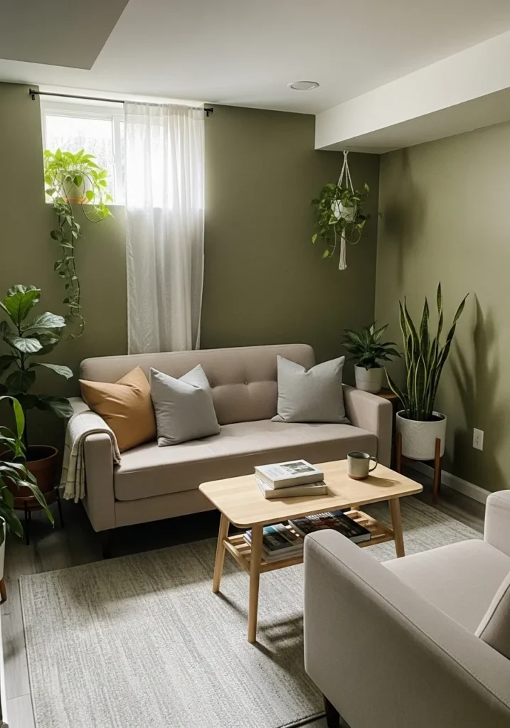 This basement lounge uses a muted green backdrop paired with soft lighting and cozy seating.