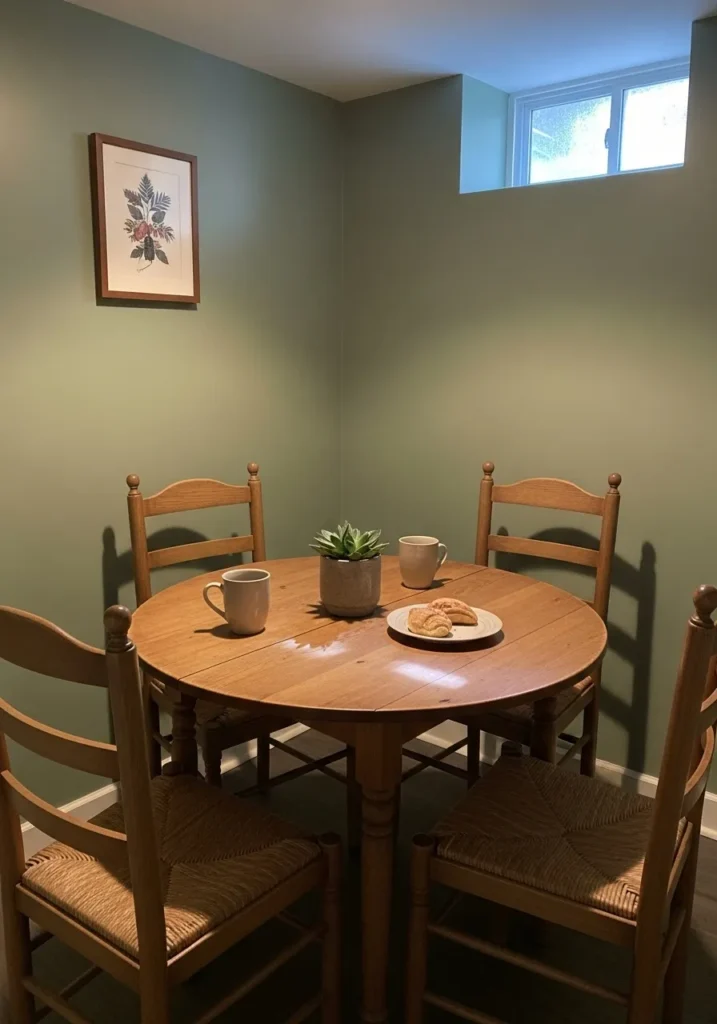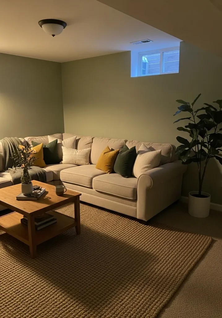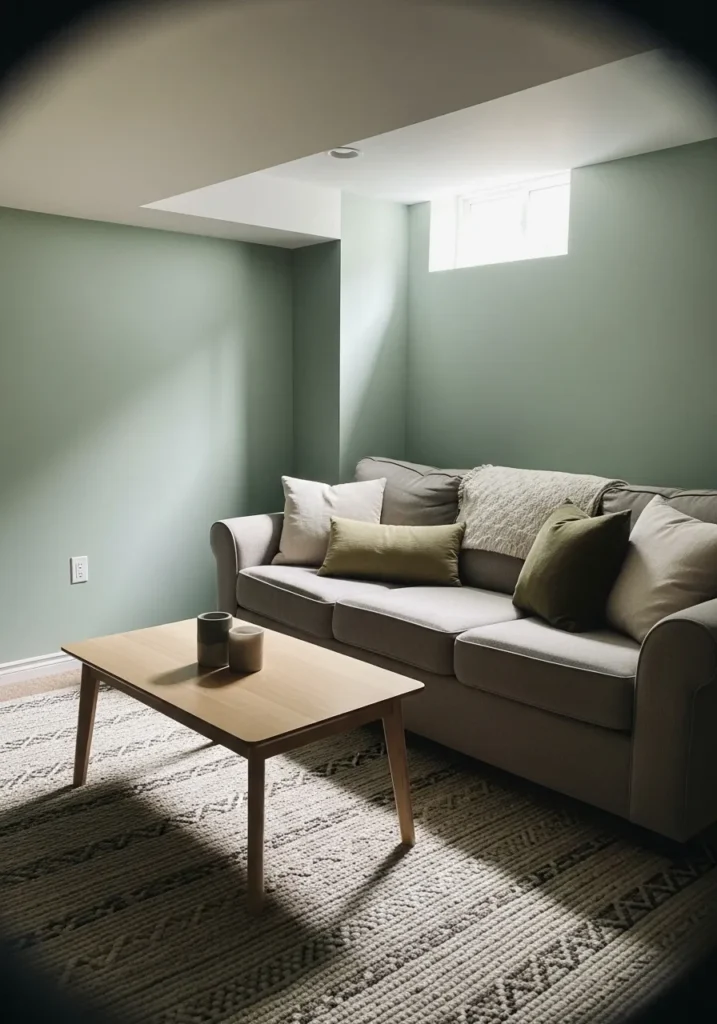 This basement corner is painted in a muted green that instantly softens the space and makes it feel calm and grounded.