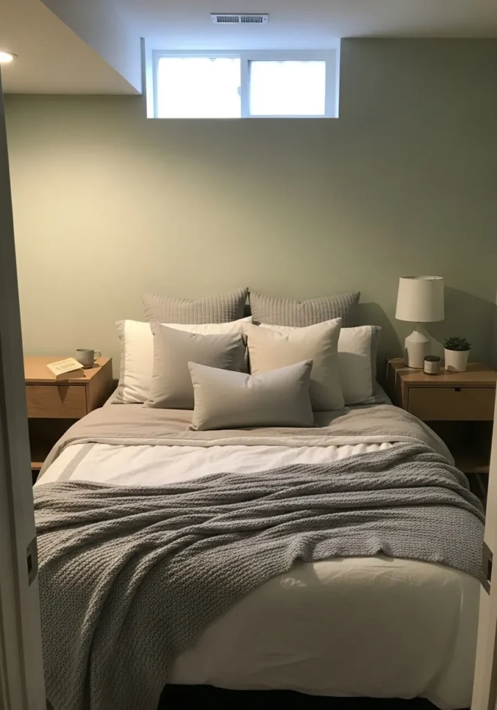 I’m a big fan of green in basement bedrooms because it feels soothing without being boring.