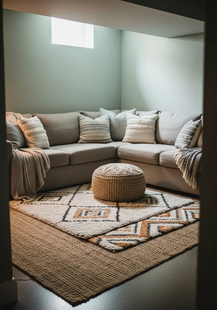 A sectional sofa, layered rugs, and a few plants help the room feel inviting and lived in.