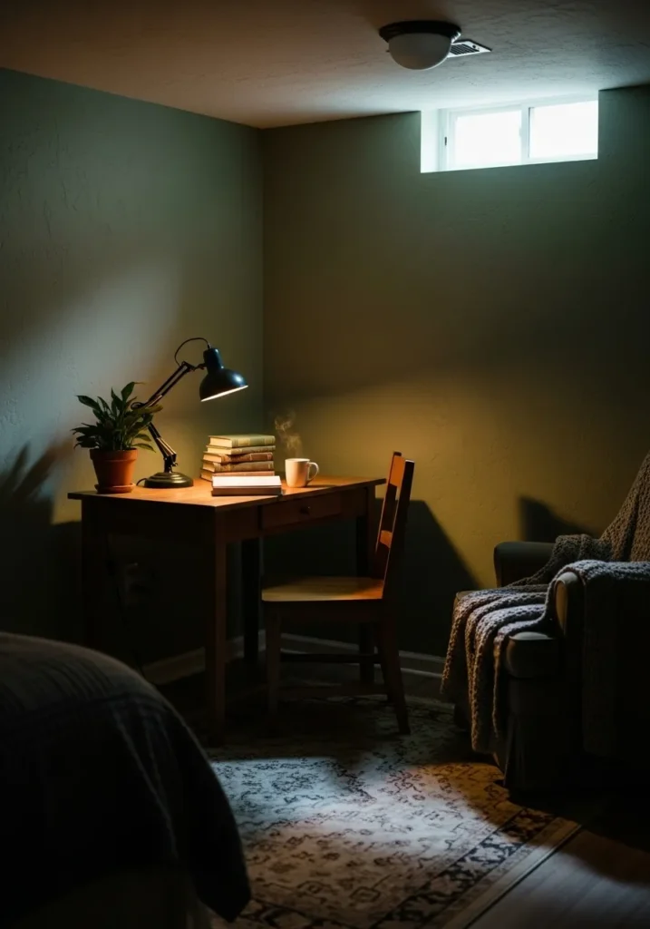 That green shade makes the basement feel finished and inviting, like a place meant for quiet evenings and slow weekends rather than just extra space.