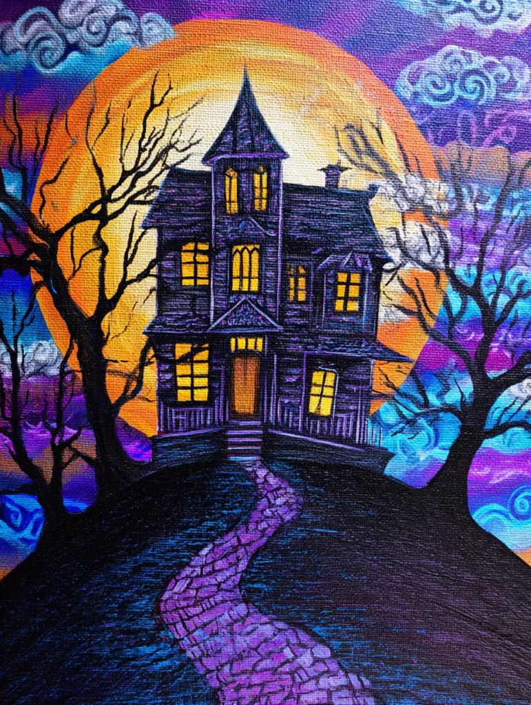 This design features a towering purple Victorian house sitting atop a dark hill with a winding stone path leading straight to the front door. A massive orange and yellow moon dominates the background, casting a warm glow that contrasts beautifully with the deep violets and blues of the swirling sky. The black silhouettes of gnarled, leafless trees frame the scene, while the windows of the house glow with a bright golden light. Every brushstroke on the canvas adds a bit of texture, especially in the cobblestone walkway and the curly white clouds that dance around the moon.