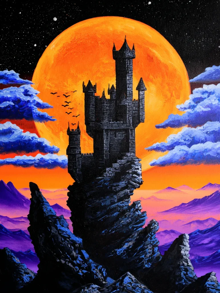 This striking design features a tall, crumbling Gothic castle perched precariously on a jagged rock formation. A massive, glowing orange moon sits directly behind the fortress, making the dark stonework stand out in sharp detail. Fluffy blue clouds drift across the center of the canvas, while the bottom is filled with hazy purple mountain peaks that fade into the distance. The artist used a lot of horizontal brushstrokes to create the hazy atmosphere and short, dabbing motions for the rough texture of the rocky cliffs.