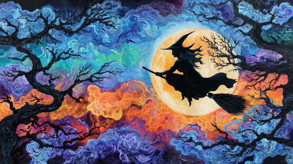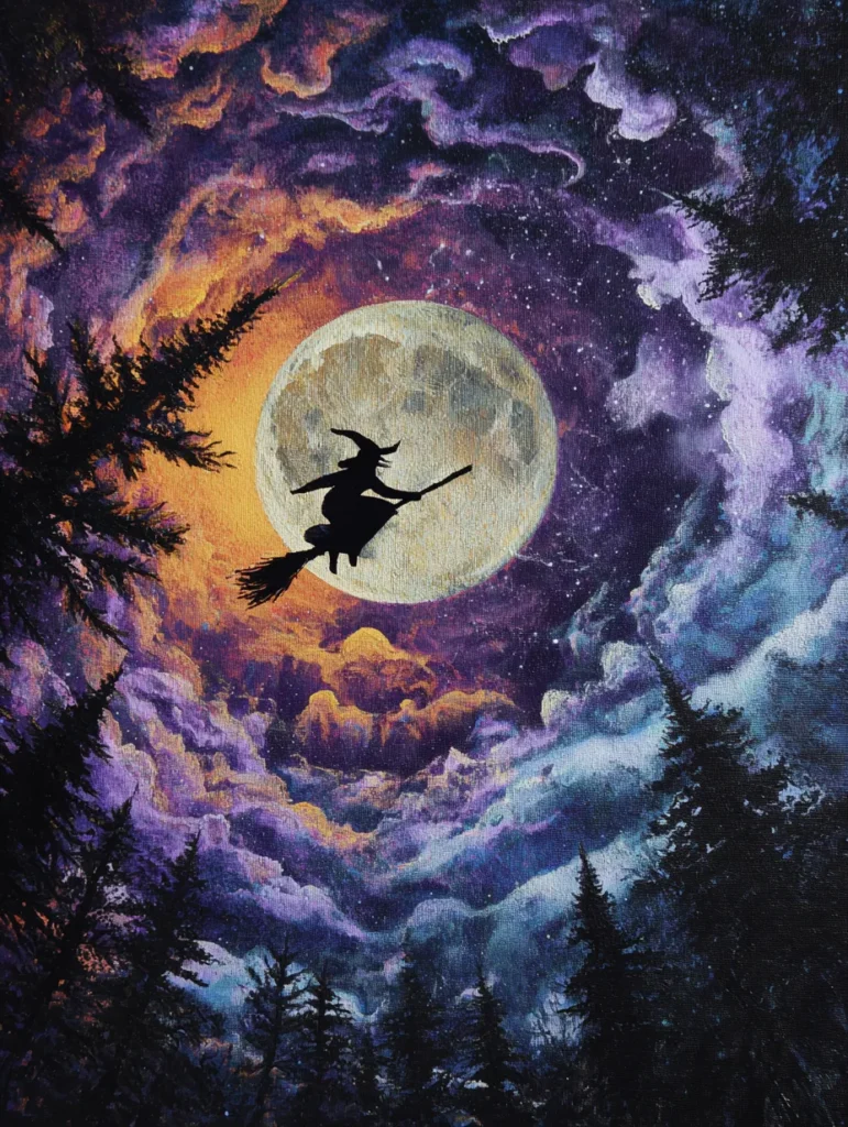 Midnight Witch Flight Through Celestial Clouds