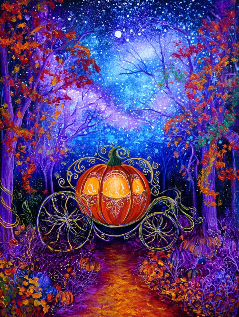 This enchanting design features a glowing orange pumpkin transformed into a whimsical carriage, complete with intricate gold filigree wheels and swirling decorative trim. It sits nestled in a vibrant purple forest where the trees are topped with fiery red and orange leaves. The sky above is a dazzling explosion of blue and white starlight, resembling a far-off galaxy. The artist used fine, delicate lines for the golden details of the carriage and a dappled, pointillist style for the sparkling sky, creating a scene that feels like it’s straight out of a fairy tale.