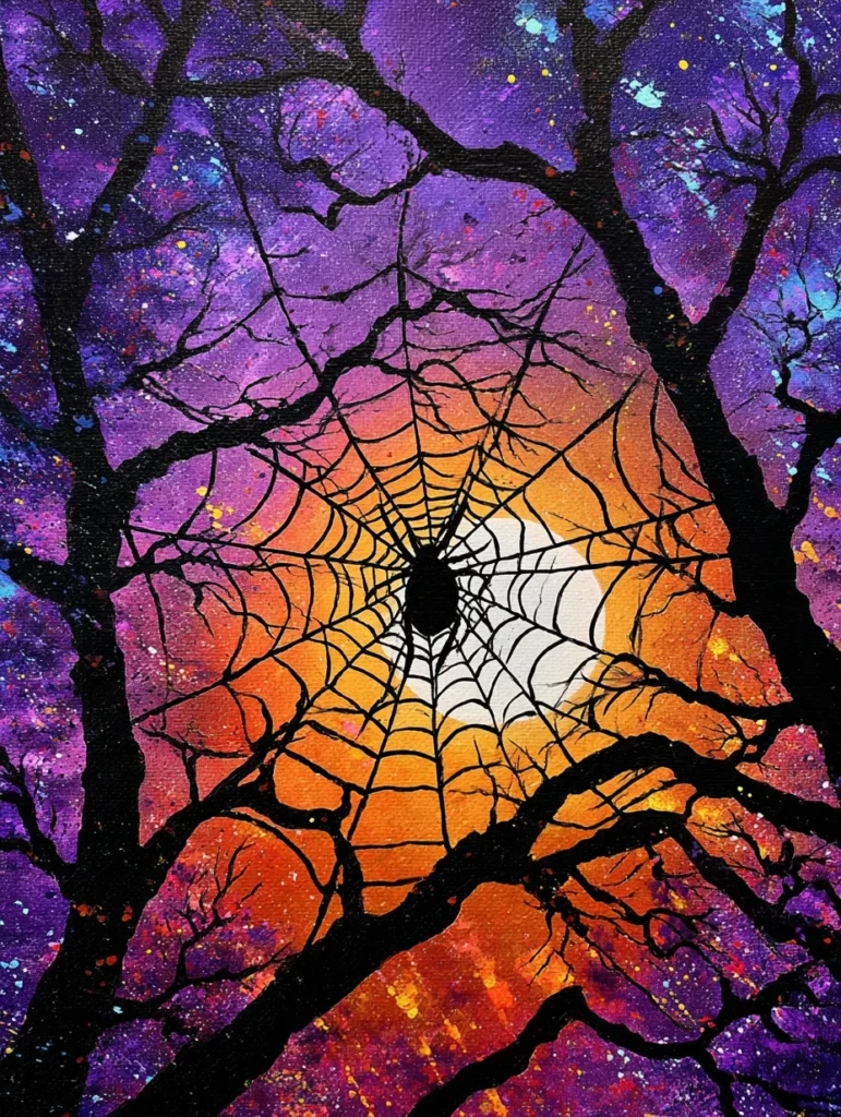 You might find it really peaceful to concentrate on the geometric patterns of the web while your background colors dry. It is a fantastic way to experiment with paint splattering techniques to create that starry, energetic atmosphere without needing a lot of precision. I feel like the bold orange center makes the whole piece feel warm and inviting, even with the spooky spider theme. It’s definitely a showstopper that looks much more complicated to paint than it actually is!