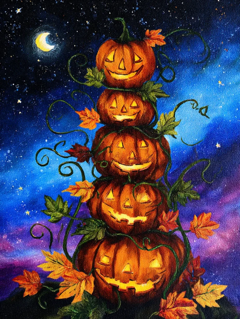 This design features a charming stack of five carved pumpkins reaching up toward a starry night sky. The deep indigo and violet backdrop is textured with fine white splatters that mimic distant galaxies, creating a dreamy contrast for the warm, glowing faces of the lanterns. Each pumpkin has its own unique grin, highlighted with bright yellow and orange brushstrokes to make it look lit from within. Twisting green vines and a few crisp autumn leaves in shades of gold and rust wind around the stack, grounding the vertical composition while a glowing crescent moon keeps watch from the upper corner.