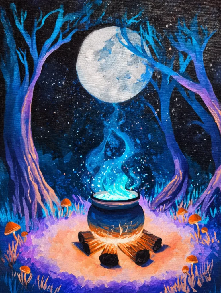 Some people might think painting fire and light is tricky, but this design makes it such a fun and relaxing experiment with color blending. I find the glow emanating from the base of the cauldron particularly satisfying to create, as it really makes the whole forest floor come alive. It’s an engaging way to play with light and shadow without needing to be too precise, allowing you to just go with the flow of the paint. Recreating that magical blue vapor is the perfect excuse to get a little messy with your highlights and let your creativity shine.