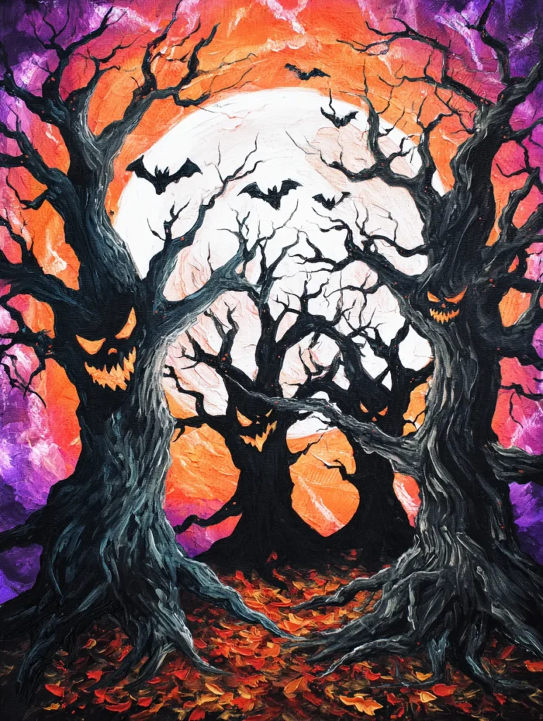 This striking composition features a trio of gnarled, dark trees with jagged branches that look like they’re reaching out from the canvas. The artist used thick, textured brushstrokes to give the barks a realistic, weathered feel, while the tree trunks reveal glowing, menacing faces carved right into the wood. In the background, a massive white moon provides a sharp contrast against a fiery orange and purple sky, making the silhouettes of tiny bats pop as they flutter through the air. The forest floor is a carpet of rich red and gold autumn leaves, adding a splash of seasonal color to the base of the design.