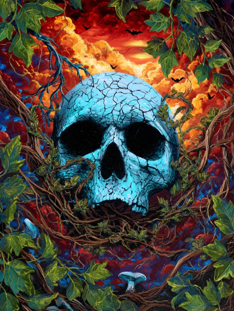 In this intense and moody composition, a weathered teal skull with intricate black cracks sits nestled among thick, twisting brown vines and vibrant green ivy. The background is a dramatic display of fiery orange and red clouds that look like a sunset on fire, with tiny black bat silhouettes scattered across the horizon. The artist used a high-contrast palette, making the cool, pale blue of the skull practically jump off the canvas against the warm, earthy tones of the foliage. Detailed brushwork brings out the papery texture of the leaves and the stony feel of the skull, while a small, lonely mushroom at the bottom adds a touch of forest floor realism.
