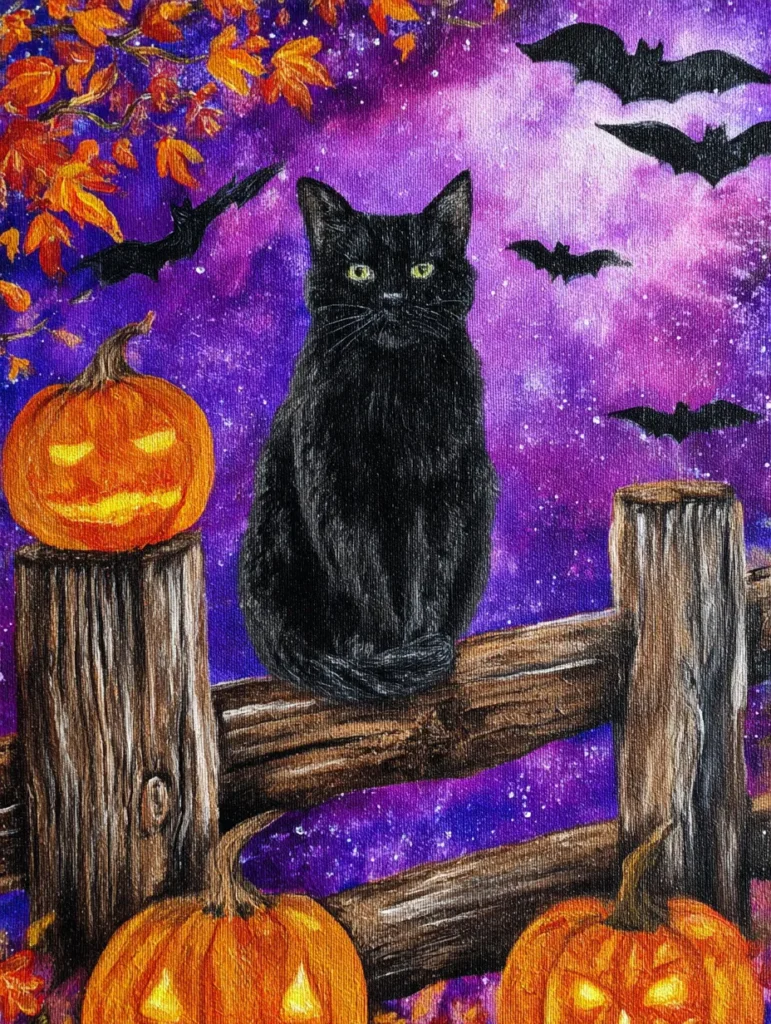 A sleek black cat with piercing green eyes sits perched on an old wooden fence in this quintessential Halloween scene. The background is a dreamy wash of magenta and deep violet, dotted with white speckles to resemble a starry nebula where several bats are in mid-flight. Bright orange jack o’lanterns with carved, glowing faces sit atop and below the fence posts, their warm light contrasting beautifully against the cool purple night. Fine, vertical brushstrokes give the wooden fence a realistic grain, while the vibrant autumn leaves in the corner add a lovely pop of seasonal color and texture.