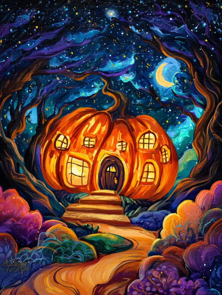I love how Halloween art can be mysterious without taking itself too seriously. One moment I am painting a haunted house with crooked windows, and the next I am adding a cheerful jack-o’-lantern that looks like it is up to something mischievous.