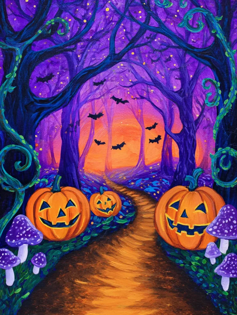 This magical scene includes a trio of smiling jack-o’-lanterns lining a winding dirt path that leads deep into a glowing purple woods. The background transitions from a bright, fiery orange horizon to a rich violet canopy, filled with silhouettes of tiny bats fluttering between the gnarled trees. Whimsical teal vines with little green leaves curl around the foreground trunks, while spotted purple mushrooms sprout up along the edges of the trail. The composition uses bright, layered brushstrokes to create a sense of glowing light reflecting off the ground, giving the whole piece a fantasy-like quality.