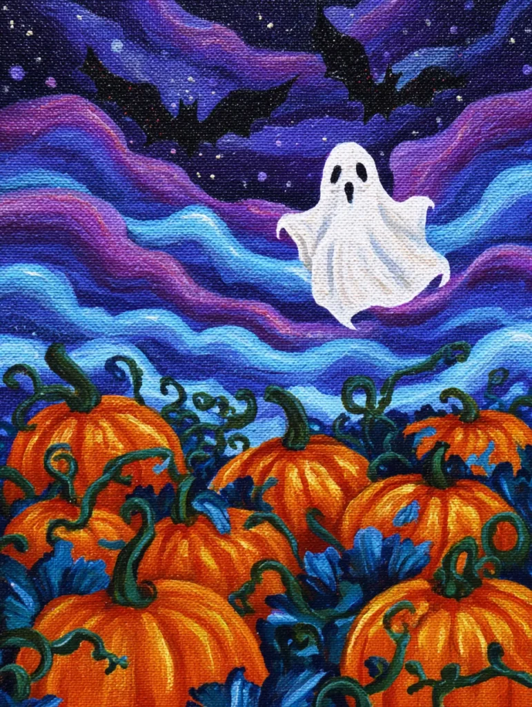 If you enjoy something that is more “cute” than “creepy,” this is a total win for your next painting session. I really enjoy how the wavy lines in the sky give you a chance to practice steady brush control while keeping the mood light and energetic. It feels quite satisfying to fill the bottom of your canvas with those round, happy pumpkins and then make the whole scene pop with that crisp white ghost. This is a brilliant choice for a quick and cheerful project that would look adorable as part of your seasonal home decor.