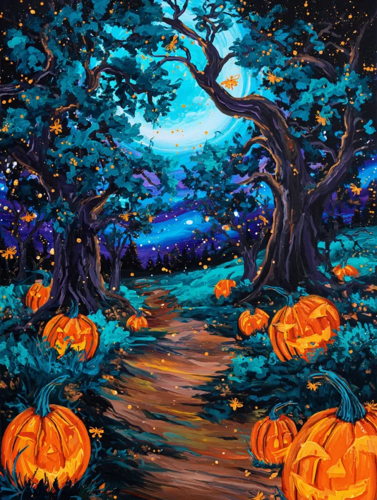 This enchanting landscape centers on a winding dirt path flanked by several glowing jack-o’-lanterns with mischievous grins. Towering, gnarled trees with dense teal foliage arch over the trail, framing a brilliant light blue moon that illuminates the entire scene. Tiny golden fireflies or magical sparks are scattered throughout the air, adding a shimmering effect against the dark, starry sky in the distance. The artist used short, impasto-style brushstrokes to create rich texture in the grass and leaves, while the warm orange light of the pumpkins provides a stunning focal point against the cool teal and indigo tones of the forest.