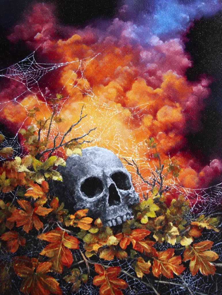 Working on this piece is a fantastic way to play with contrasting textures like the smooth bone of the skull and the wispy, light-as-air feel of the webs. You can really get into a flow state while mixing different autumnal tones for the foliage, and seeing that bright orange glow pop against the dark sky is so rewarding. It feels like a slightly more sophisticated take on Halloween art that still captures all the spooky vibes we love. Using a very thin liner brush for the spiderwebs might take a bit of patience, but the final result looks so impressive and professional when you’re done.