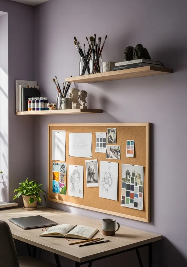 This office corner is wrapped in a soft lavender hue that feels calm but still full of personality. A sleek desk sits beneath a cork board layered with photos, sketches, and notes, giving the space an artistic heartbeat. Two simple wooden floating shelves display books, ceramics, and small decor pieces that add warmth and texture. The muted purple tone pairs beautifully with the natural wood elements, creating a balanced and welcoming setup that feels thoughtfully styled without being overdone.
