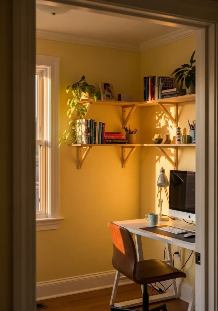 This small office nook is painted in a cheerful golden yellow that instantly brightens the space. Floating shelves above the desk hold plants and decor that pop against the sunny backdrop. The compact desk setup fits neatly into the room, making the most of every inch. Warm lighting enhances the yellow tone and gives the nook a cozy glow.
